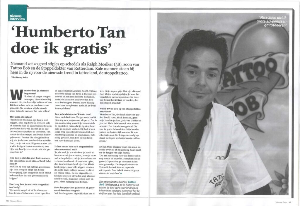Niemand zet zo goed stipjes op schedels als Ralph Moelker (38), zoon van Tattoo Bob en de Stoppeldokter van Rotterdam. Kale mannen staan bij hem in de rij voor de nieuwste trend in tattooland, de stoppeltattoo.